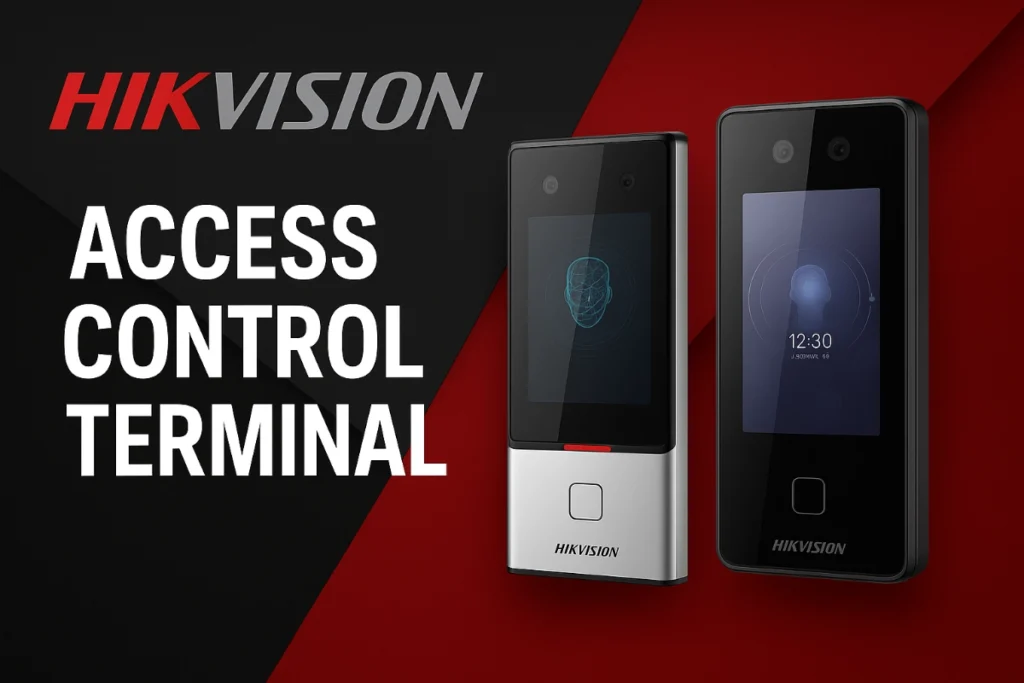 A Hikvision recognition terminal sits at the entry and verifies the person in front of it. Modern models use deep learning for face, fingerprint and palm recognition. Advanced terminals include anti spoofing to stop photos or videos being used to open a door.