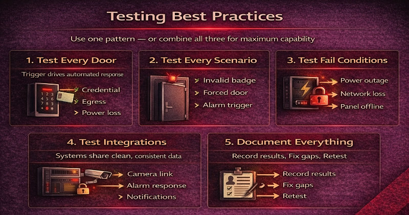 acceptance tests for each workflow: intercom call unlock, alarm to camera tour, forced door to video bookmark